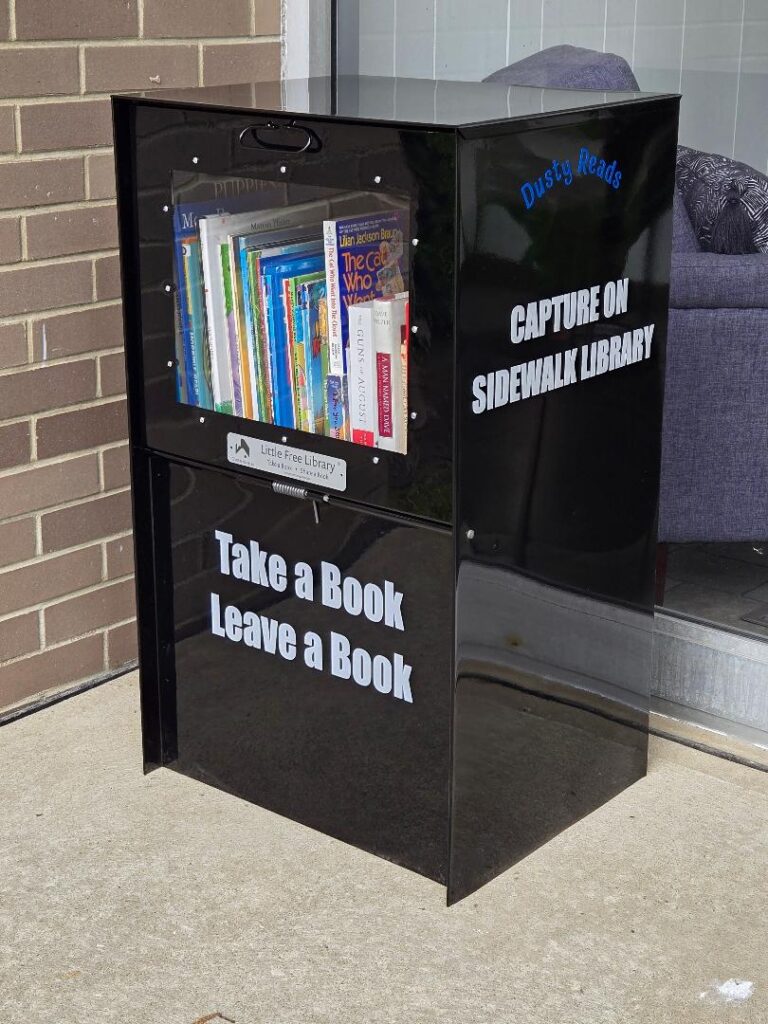 This handsome Little Free Library is the fourth one sponsored by Dusty Reads. It stands in front of Capture On Labs in Willoughby, carrying books for adults and children.